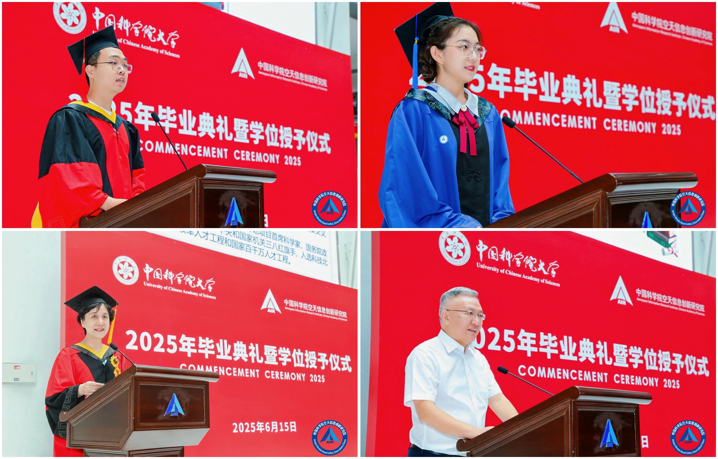 导师代表、空天院研究员蔡新霞回顾了与同学们共同奋斗的科研岁月,勉励毕业生将个人理想融入国家科技蓝图,以开放胸怀应对全球挑战,努力为空天信息发展贡献智慧力量。毕业生家长代表余孝海对空天院和老师们对孩子们辛勤培养表示由衷感谢,寄语毕业生在国家战略产业中大显身手,成为兼具家国情怀与人文温度的科技栋梁。